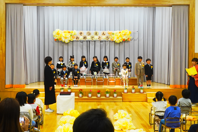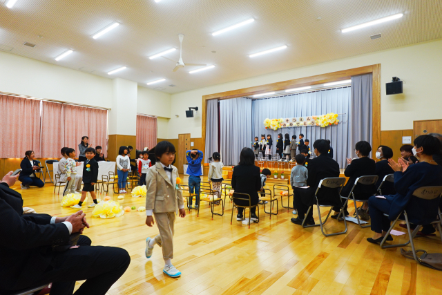 自分たちは卒園するので、「4歳児にバトンタッチします!」と言って、バトンタッチのお花を持って歌いました。元気でかわいい歌声に、感動しました!!!(/ω\)